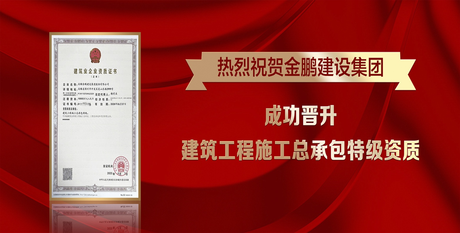 金鵬控股集團始創于1993年,致力于成為中國領先的“智能建造和美好生活城市運營商”,位居中國民企500強,安徽民企前10強,AA級主體信用等級,授權專利500+,發明專利50+,年產值超300億元。